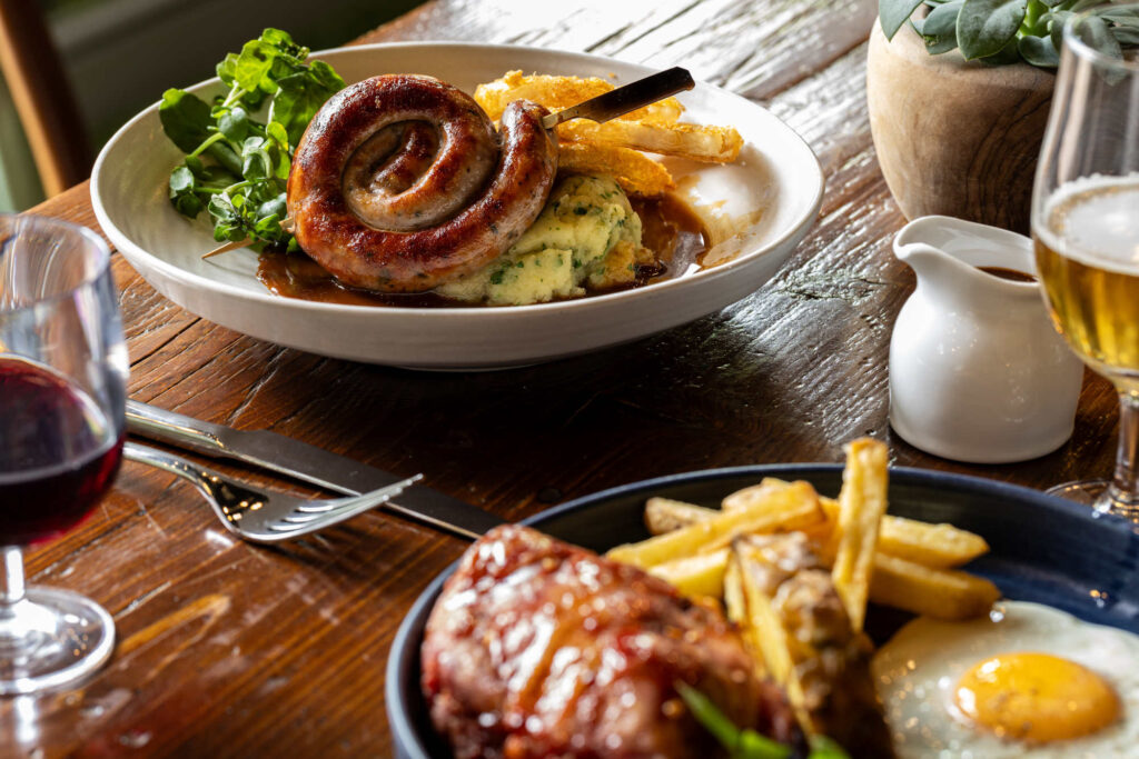 Cumberland sausage ring, herby mash, beer-battered onion rings, gravy | 13.95 927 kcals